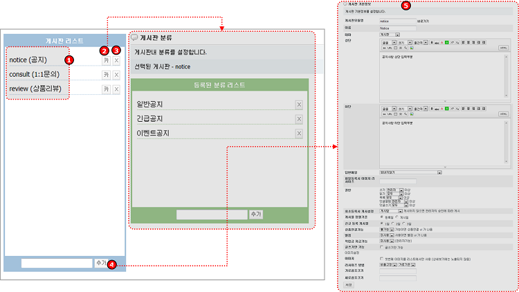 - * notice(공지사항) , review(상품리뷰), consult(1:1문의)해당 게시판의 게시글 분류를 추가/수정/삭제 가능합니다.