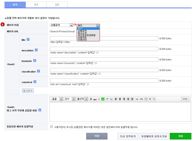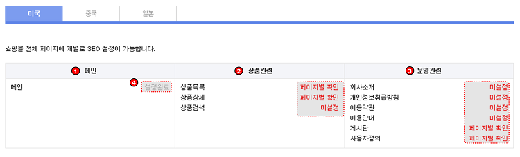 - ① 페이지 이름 : - 메인, 상품검색, 회사소개, 개인정보처리방침, 이용약관, 이용안내 페이지의 설정방법은 동일합니다. 설정방법은 SEO 기본설정페이지에서 안내받으실 수 있습니다.