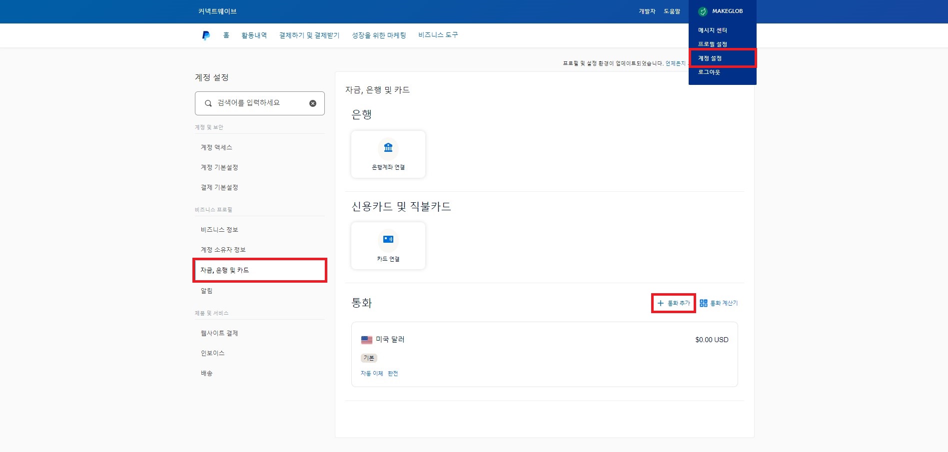 1. [계정설정 > 자금, 은행 및 카드 > 통화 > 통화 추가]를 선택 하세요.